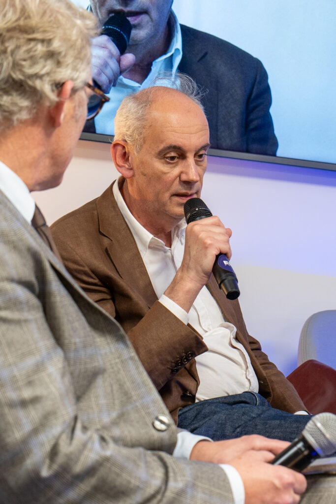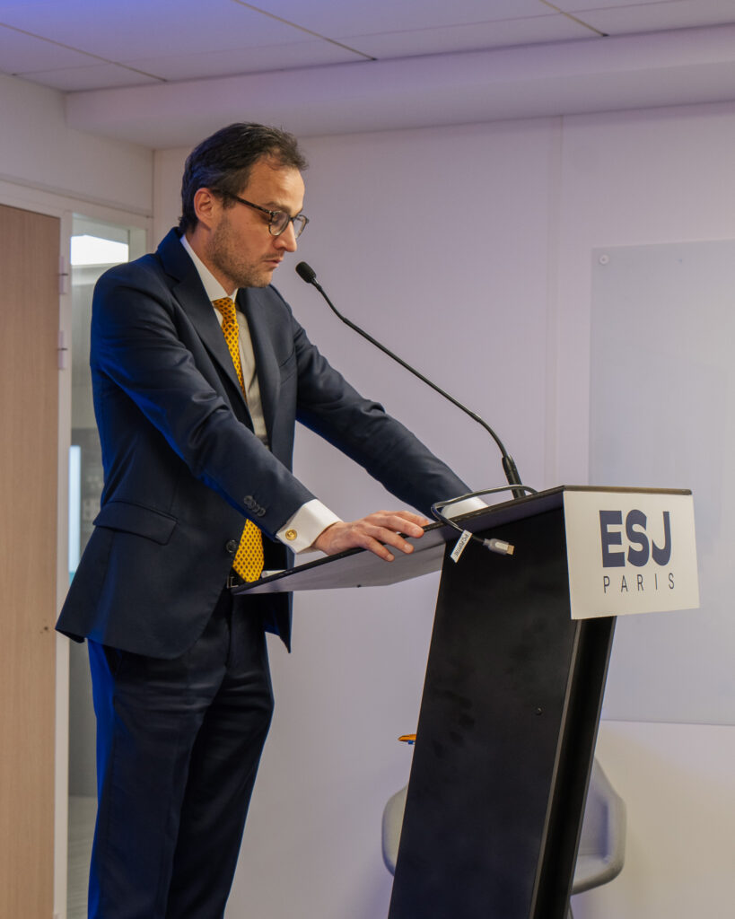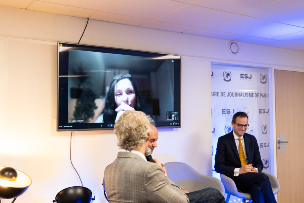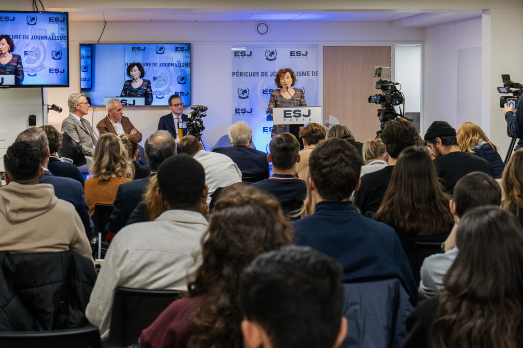 Nous avons eu l’honneur et la joie de maintenir la cérémonie officielle de baptême de notre salle, en présence notamment de Sabeha Sansal, fille de Boualem Sansal, en visio-conférence depuis Prague, Noëlle Lenoir, ancienne ministre des Affaires européennes et membre du Conseil Constitutionnel, présidente du Comité de soutien de l’écrivain, et Arnaud Benedetti, fondateur du Comité de soutien de Boualem Sansal. Les membres de la direction, les professeurs et les étudiants de l’ESJ Paris s’y sont réunis autour du comité de soutien, célébrant ensemble cette très grande nouvelle.